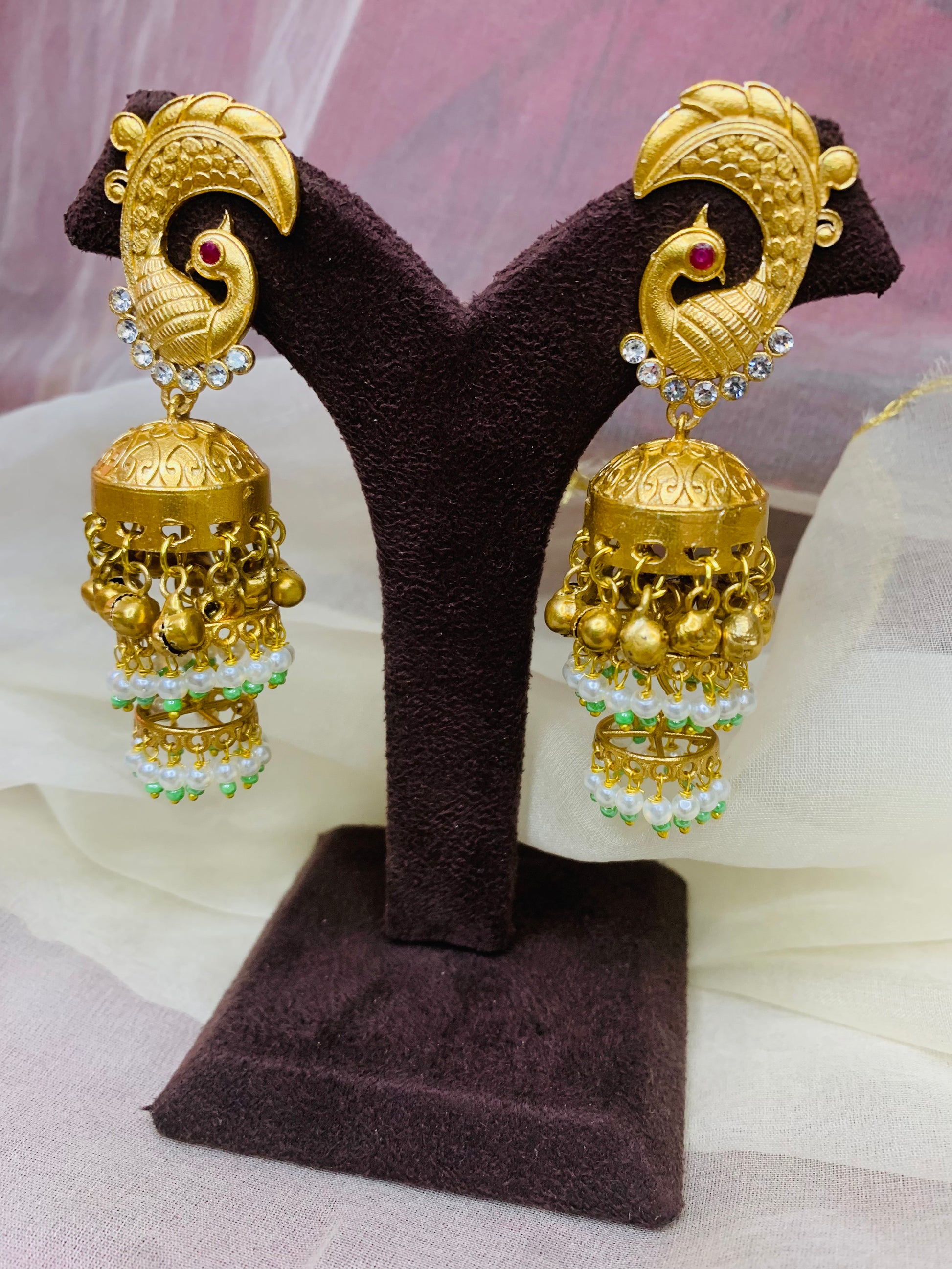 Add a timeless charm to your look with these exquisite Jhumka earrings. Crafted with intricate detailing and traditional artistry, these earrings showcase a perfect blend of elegance and culture
